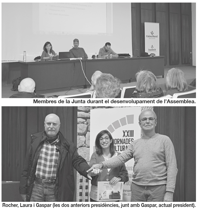 2- Estat de comptes 2018 i memòria d’activitats del 2018: es fa el balanç econòmic del compte que s’havia obert per a gestionar els ingressos i les despeses relatives a l’organització de les Jornades culturals (total ingressos 18.205 euros i total despeses 14.003 euros). S’acorda que es farà el traspàs del remanent d’esta llibreta al compte general de l’Associació Cultural i es tancarà definitivament este compte.